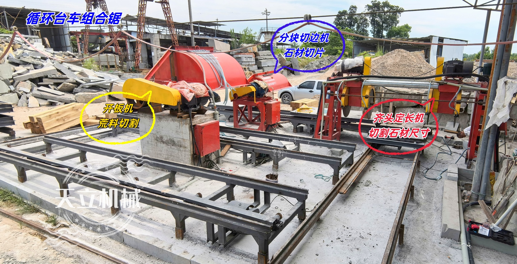 新循环台车组合锯由三台设备组成(开板机、齐头定长机、分块切边机),协同完成荒料开板、定长切割、分块切边全流程,构建高效连贯的石材切割生产线。专为路沿石、条石、墓碑石等石材设计,采用循环台车与高强度锯条技术,实现连续精准切割,提升生产效率30%以上。